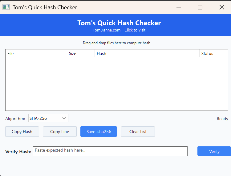 Tom’s Quick Hash Checker: drag & drop a ZIP/EXE, compute SHA-256, then verify against the expected checksum.